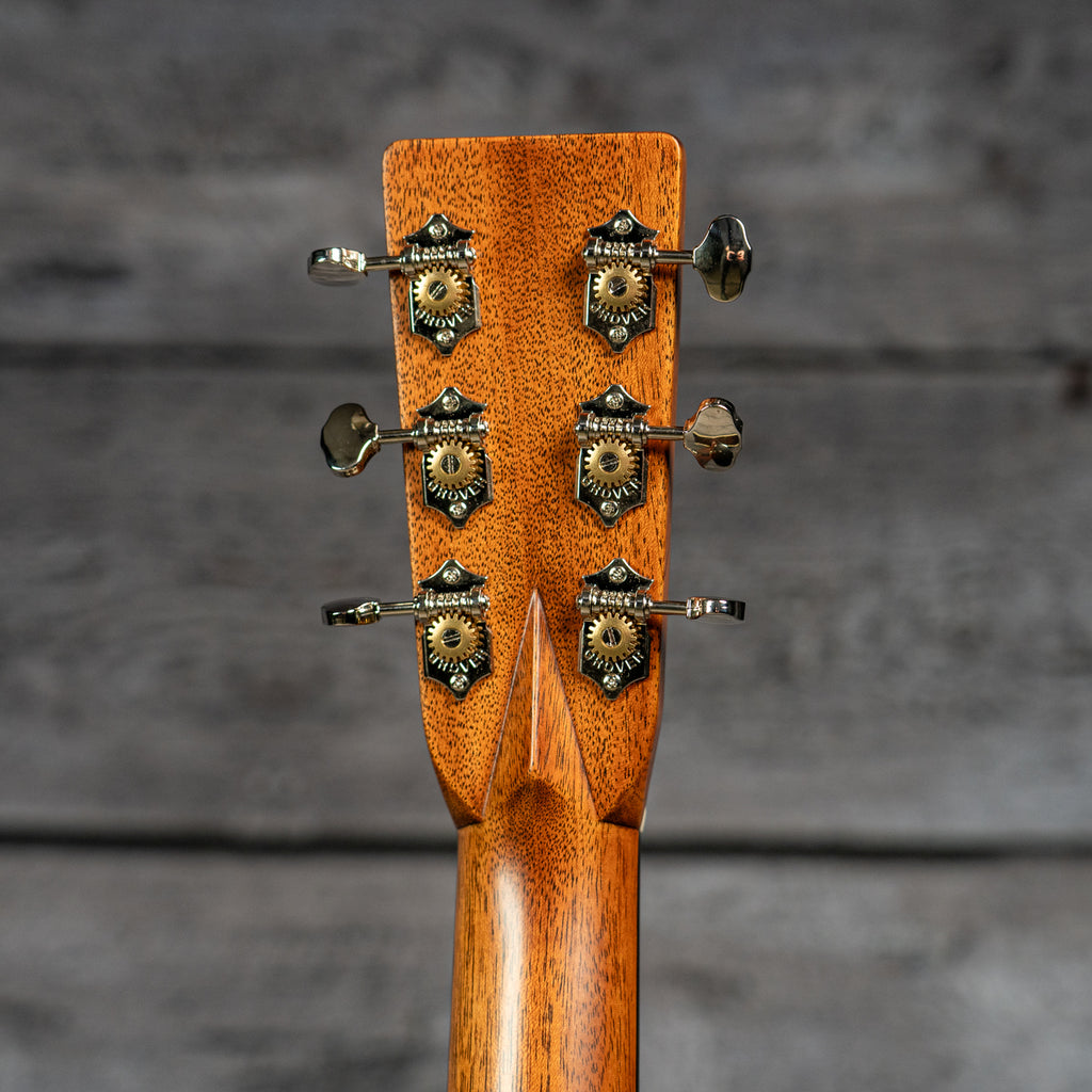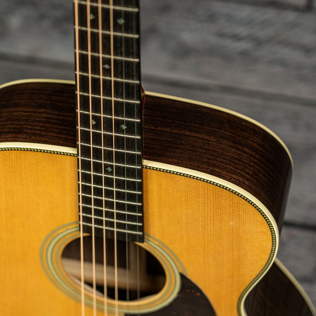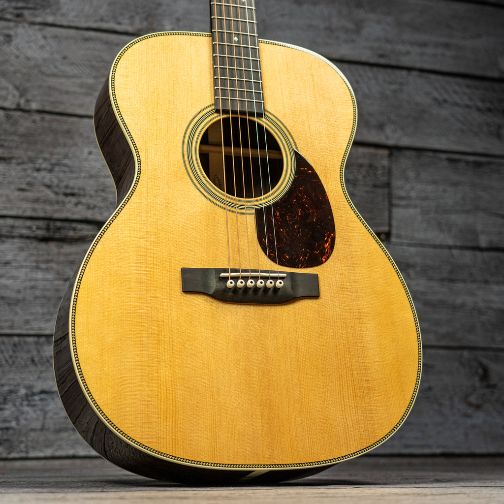 The satin neck with a Golden Era (GE) Modified Low Oval profile and high-performance taper ensures smooth playability. Complete with bold herringbone top inlay, antique white binding, and an ebony bridge with bone pins, the OM-28 is a timeless classic for today’s player."